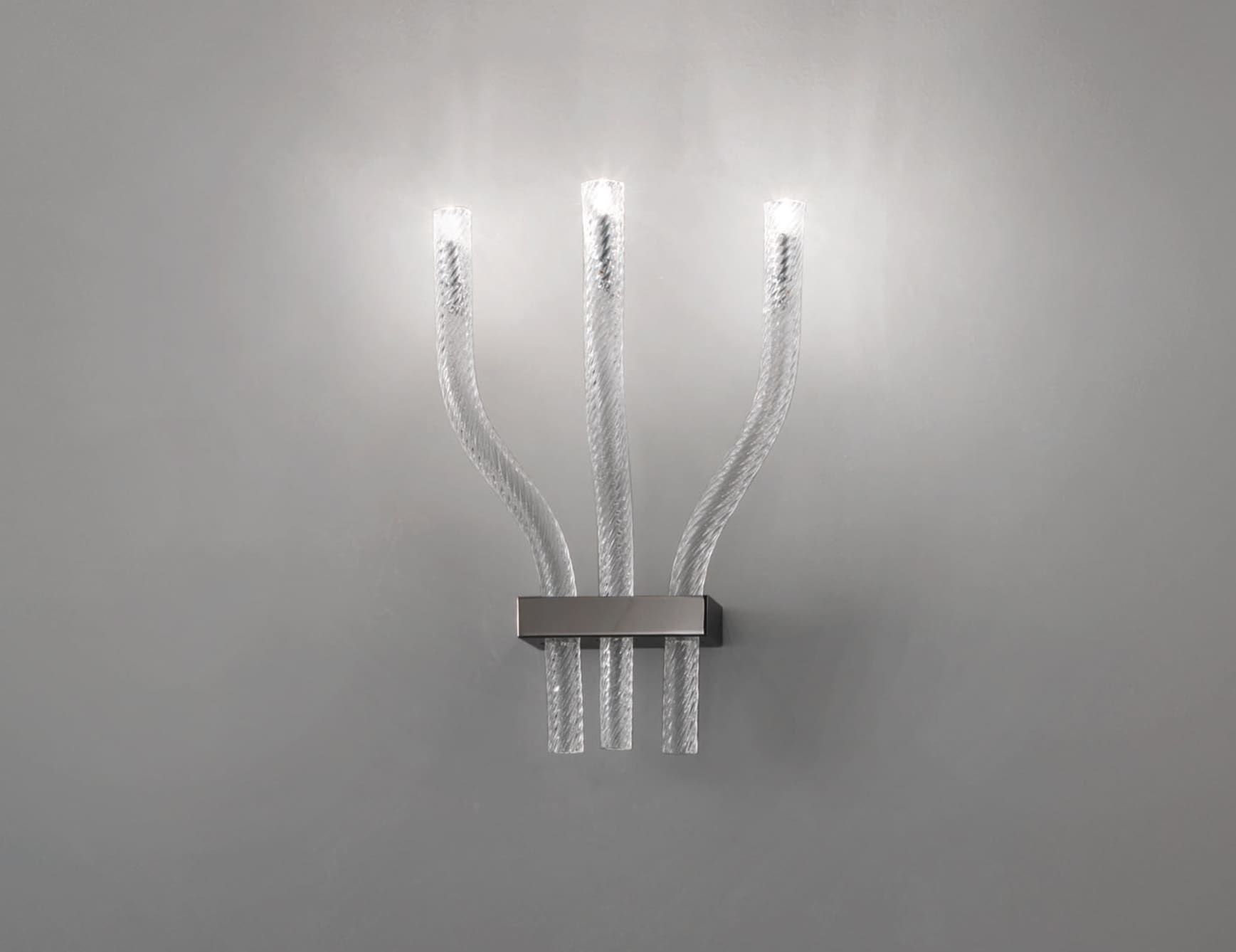 Stardust wall light shown in crystal striped glass. Structure composed in black nickel. This collection combines cutting edge designs by leading international designers with the secrets of the traditional craft of glass blowing. Available in a hanging light version. Made in Italy.