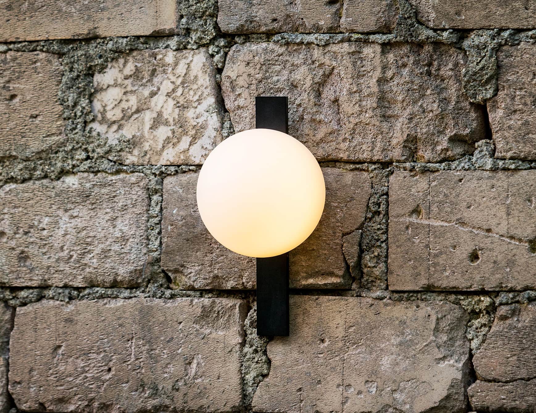 Circ modern Italian wall light is shown in a metallic frame. Sconce globes may be suspended from a metal bar or ringed by a thin metal ring. Bathrooms and hallways are two instances of indoor use. Versions for use outdoors brighten stairways and terraces. The lighting collection offers innovative designs while incorporating several finishes to create unique fixtures for residential and commercial spaces. Custom-made projects are available.