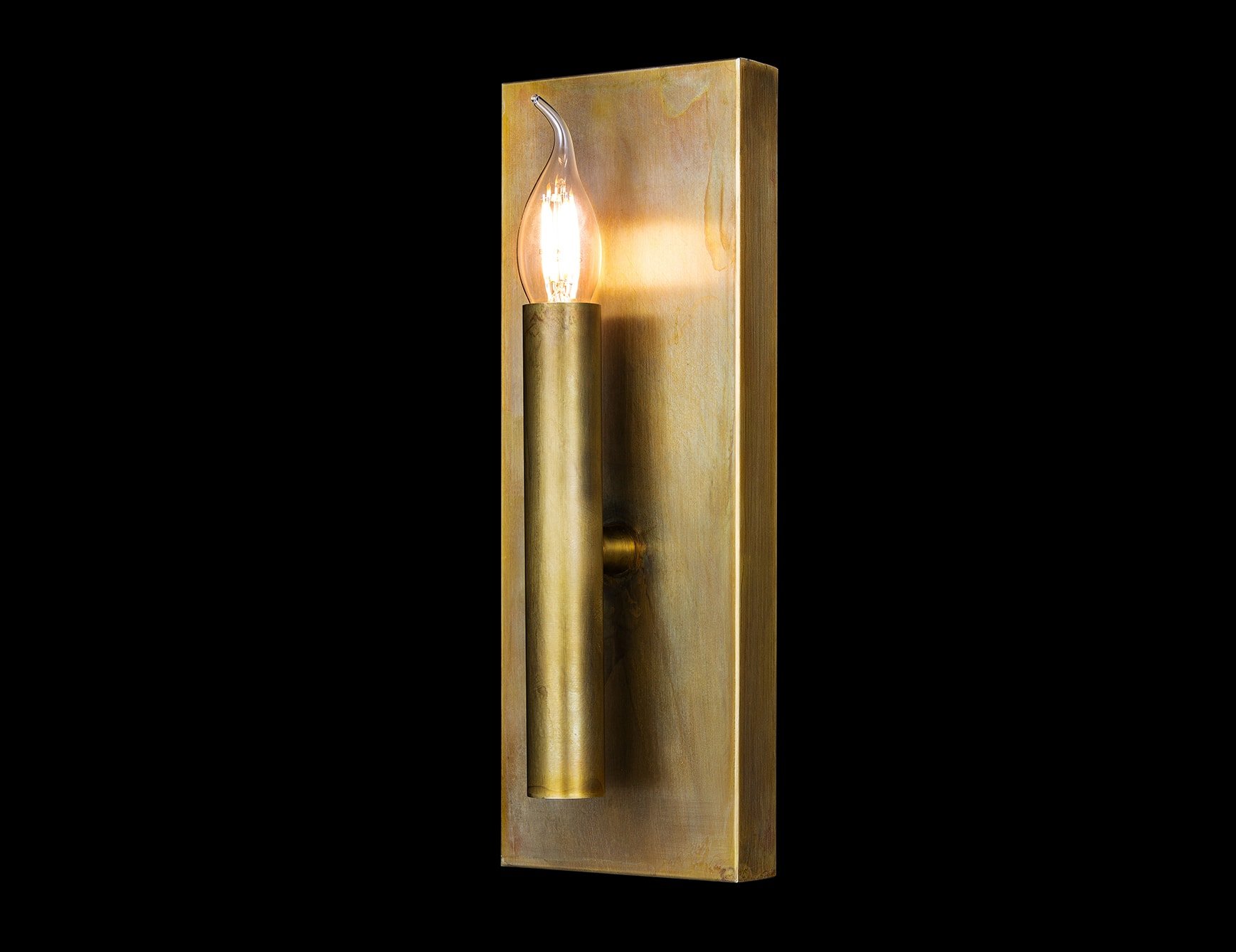 Shiro modern Italian wall light is shown in brass burnished finish with one lightbulb. Finish options: black matt and brass burnished finish. The Shiro – Japanese for castle - is the result of a journey of deconstruction. Stripped of all but the bare yet beautiful essentials, this new collection permits for a well composed equilibrium. It allows serenity to triumph over chaos. Shiro collection is also available as a ring hanging light, horizontal hanging light and vertical hanging light version. Made in Italy.