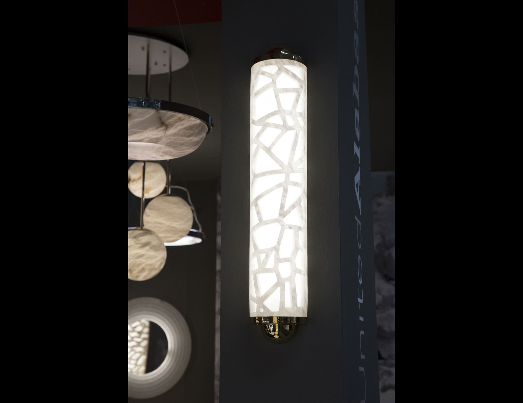 Trencadis luxury Italian wall light shown in Alabaster with matt chrome metal. This collection features a historic natural stone called Alabaster with it's contemporary elements, metals, coatings and lighting designs. Alabaster creates an elegant and transulent effect. Metalic finish available in chrome or gold. Made in Italy.